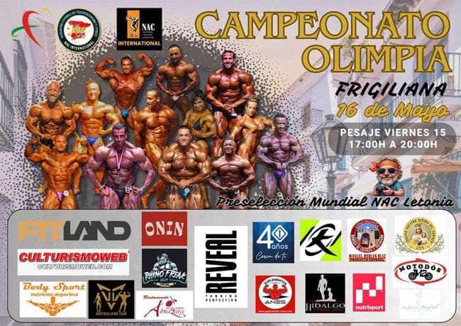 Tal y como se avanzaba en reseñas informativas previas, el día 16 de mayo tendrá lugar en Frigiliana una nueva edición del Campeonato Olimpia AEFF. La cita servirá además como preselección para el Mundial NAC, que este año tiene lugar en Letonia. Abrimos el monográfico para acompañar el póster oficial de la cita.