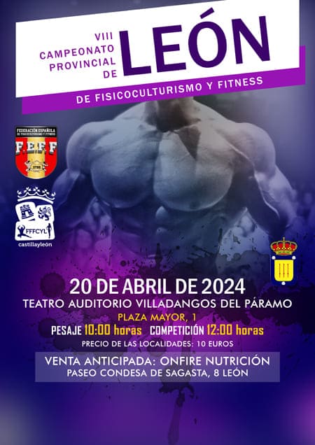 El día 20 de abril tendrá lugar en el Teatro Auditorio de Villadangos del Páramo una nueva edición del Campeonato Provincial de León de Fisicoculturismo y Fitness. En lo referido al programa de horarios, el pesaje de atletas dará comienzo a las 10:00 horas, y la competición propiamente dicha a partir de las 12:00 horas. Con respecto a la venta de localidades por anticipado, los interesados deben remitirse al establecmiento Onfire Nutrition, sito en el Paseo de la Condesa de Sagasta, número 8.